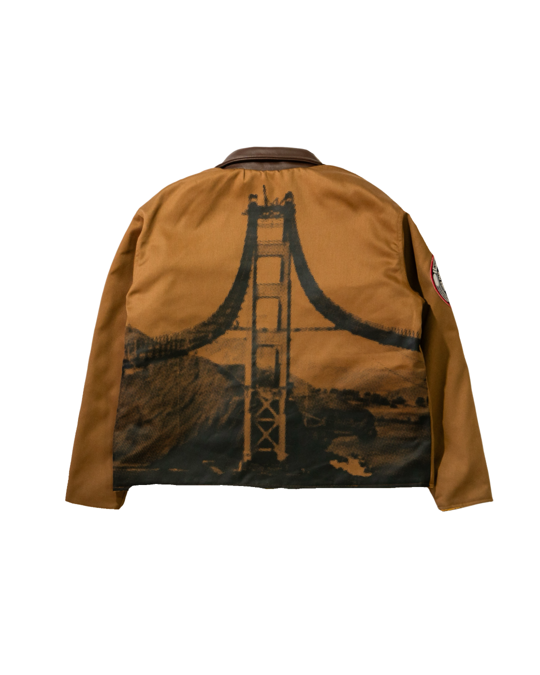 Side A: Earth-tone canvas with a tonal Golden Gate Bridge graphic and custom sleeve patch.
