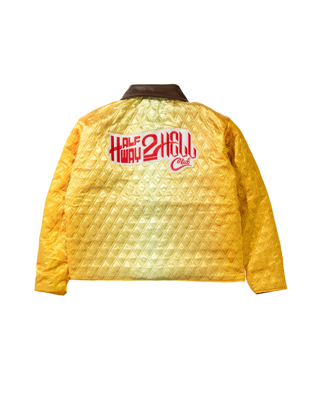 Side B: Yellow quilted satin with diamond stitching, faux leather collar, and bold “Half Way 2 Hell Club” back patch.